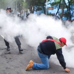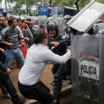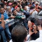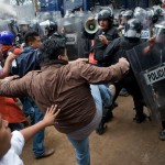 Superados en número, los policías intentaron detener el avance de los maestros con escudos. Rebasados, lanzaron golpes de tolete y dispararon extintores. Los maestros contestaron con las manos, aunque algunos logrando hacerse de los escudos de los uniformados.