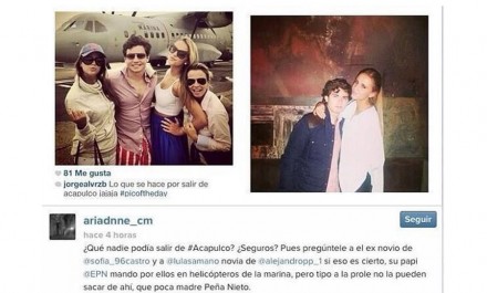 MÉXICO, D.F., (proceso.com.mx).- En las redes sociales circula una fotografía en la que aparece el hijo del exsubsecretario de Comunicaciones, Jorge Álvarez Hoth junto con tres jóvenes mujeres de las que se dice son hijas del presidente Enrique Peña Nieto y Angélica Rivera, y quienes, según el mensaje, habrían recibido privilegios para ser rescatados de Acapulco en un avión de la Marina.