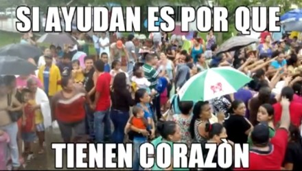 “Si ayudan es porque tienen corazón”, “Aquí no se ha visto más interés el ke ayudar”, rezan los textos mientras se graban las imágenes repartiendo los víveres entre cientos de mujeres, niños, hombre de la tercera edad, que fueron afectados por Ingrid.