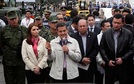 Bajo estricto control militar y policiaco de la zona, Peña Nieto paseó por el lugar con su esposa, Angélica Rivera. Lo acompañaron también el secretario de Gobernación, Miguel Ángel Osorio Chong, a quien ayer ratificó como responsable de atender la emergencia, y del subsecretario de dicha dependencia y vocero de seguridad del gobierno, Eduardo Sánchez.