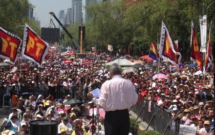 Tras una marcha, López Obrador realizó un mitin sobre el Paseo de la Reforma, a la altura de la Torre del Caballito, ante la imposibilidad de llegar al Zócalo capitalino.