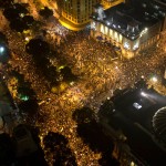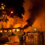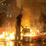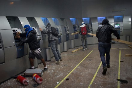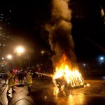 Unos 200 embozados del grupo anarquista Black Blocs trataron de invadir el edificio público, lanzando bombas Molotov contra la fachada y quemando basura en la calle.