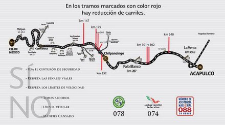 En un comunicado, la dependencia que encabeza Gerardo Ruiz Esparza informo a los automovilistas que en los kilómetros 147, 179, 202, 217, 252, 301, 302 y 340 se reducirán los carriles porque todavía se realizan obras de regeneración, por lo que pidió a los automovilistas extremar precauciones.