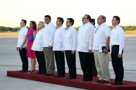 En este ambiente de tensión, a las 18 horas, llegó Peña Nieto a Mérida. Esta es su cuarta visita oficial a Yucatán. En esta ocasión vino acompañado de los secretarios de Educación Pública, Emilio Chuayffet Chemor; de Turismo, Claudia Ruiz Massieu; y de Desarrollo Agrario, Territorial y Urbano, Jorge Carlos Ramírez Marín.