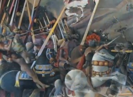 Se ha incluido una variación de la pintura de “La batalla de san Romano de Pablo Uccello y la otra Espacio desnudo en el espejo, leve espesor del aire muestra una serie de variantes sobre el mismo tema: los torsos.