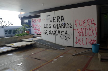 Lo que no pudieron evitar fueron los daños causados al portón y paredes, donde los inconformes realizaron pintas como “Sección 22, la única no hay dos”, “A los trabajadores del IEEPO los estamos vigilando”, “Charros traidores” y “APPO”.