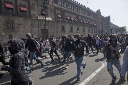 Minutos antes, luego de que concluyó el mitin en la Plaza de la Constitución, el grupo de encapuchados caminó sobre Izazaga y en esa calle rompieron los vidrios de una tienda Seven Eleven y rayonearon la fachada de un restaurante Vips y vandalizaron un camión policial.