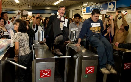 En esta última participaron activistas del #saltoporlapatria y entre las figuras que convocaron a la protesta estuvieron los investigadores John Ackerman e Irma Sandoval y el periodista Julio Hernández, quienes dieron inicio a la actividad saltando los torniquetes.