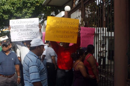 Encabezados por el delegado municipal y comisariado ejidal, Francisco Valencia García y Asunción Morales Velázquez, informaron que cerca de 10 mil cabezas de ganado se encuentran en riesgo por falta de pasturas ya que los potreros se encuentran bajo el agua.