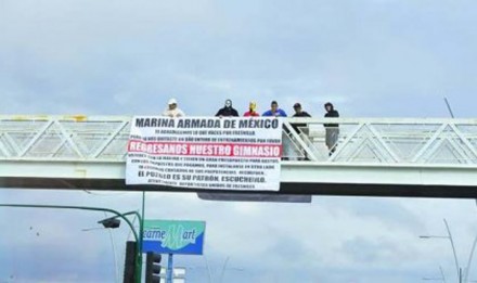 FRESNILLO, Zac.(apro).- Jóvenes colocaron mantas en un puente peatonal de esta ciudad para exigir que el destacamento de la Marina Armada de México que tiene su base en esta ciudad desaloje el gimnasio “Solidaridad” que utiliza como sede, y donde se pretende establecer de manera permanente a partir de finales de este mes.