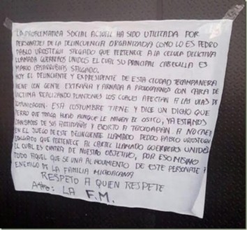 “LA PROBLEMÁTICA SOCIAL A SIDO UTILIZADA POR PERSONAJES DE LA DELINCUENCIA ORGANIZADA, COMO ES PEDRO PABLO URIOSTEGUI SALGADO, QUIEN PERTENECE A LA CÉLULA DELICTIVA LLAMADA G.U EL CUAL SU PRINCIPAL CABECILLA ES MARIO C. S. HOY DELINCUENTE Y EX PRESIDENTE MUNICIPAL DE ESTA CIUDAD TECAMPANERA, VIENEN CON GENTE EXTRAÑA Y ARMADA A PROVOCARNOS CON CARA DE VICTIMAS REALIZANDO PLANTONES LOS CUALES AFECTAN LAS VÍAS DE COMUNICACIÓN ESA COSTUMBRE TIENEN ”PERRO QUE TRAGA HUEVO AUNQUE LE MAJEN EL HOCICÓ ” YA ESTAMOS CANSADOS DE SUS ARTIMAÑAS Y EXHORTO A TELOLOAPAN A NO CAER EN LOS JUEGOS DE ESTE DELINCUENTES LLAMADO PEDRO PABLO, QUE PERTENECE AL CARTEL DE G.U EL CUAL ES CONTRA DE NUESTRO OBJETIVO . TODO AQUEL QUE SE UNA AL MOVIMIENTO ES ENEMIGO A LA FAMILIA MICHOACANA, RESPETO A QUIEN RESPETE. ATTE. LA F.M. “.