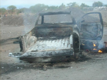 El cuerpo de El Pollo fue encontrado calcinado dentro de su camioneta Nissan Frontier placas NK02682 de Michoacán, junto con José Luis Nino Torres, en una brecha.