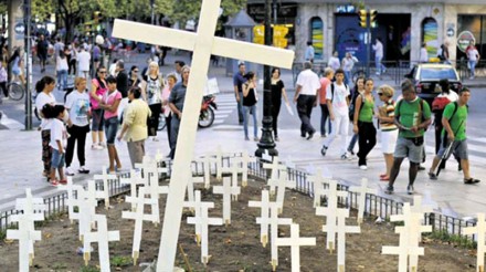 BUENOS AIRES, Rosario (apro).- Las 68 cruces blancas tienen unos 50 centímetros de altura. Se incrustan en el césped de la Plaza Pringles, en pleno centro de la ciudad de Rosario. En cada una puede leerse el nombre de una persona asesinada de manera violenta en los primeros 65 días del año 2014.
