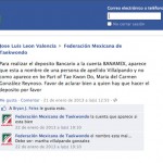 MÉXICO, D.F. (apro).- La Federación Mexicana de Taekwondo, que encabeza Juan Manuel López Delgado, ha solicitado a sus afiliados que depositen el pago de inscripciones a torneos selectivos en una cuenta a nombre de su esposa, Martha Villalpando González.