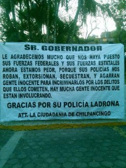 “Sr. Gobernador. Le agradecemos mucho que nos haya puesto sus fuerzas federales y sus fuerzas estatales, ahora estamos peor, porque sus policías nos roban, extorsionan, secuestran y agarran gente inocente para incriminarlos por delitos que ellos cometen, hay mucha gente inocente que están involucrando. Gracias por su policía ladrona. Att. La ciudadanía de Chilpancingo” (sic).