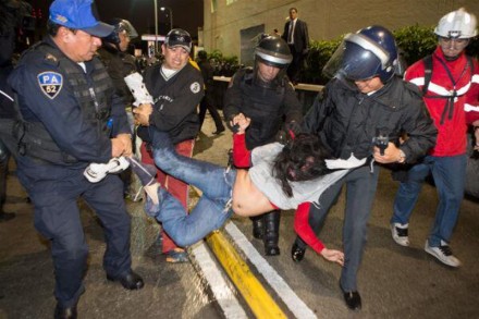 Después de varios minutos de tensión entre manifestantes y policías, refirió la CDHDF, los policías comenzaron a empujar a varias personas que se manifestaban pacíficamente, y a empellones y jaloneos comenzaron a alejarlos de la acera de la empresa de Emilio Azcárraga Jean.