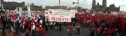 Miembros de la Confederación de Trabajadores de México, de la Unión Nacional de Trabajadores, del Sindicato de Telefonistas de la República Mexicana y del Sindicato Nacional de Trabajadores de la UNAM permanecen en el Zócalo de la ciudad de México en espera del resto de los contingentes.