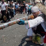 Estimulados por la marcha de 10 kilómetros que emprendieron durante la mañana bajo un sol a plomo, y un poco ebrios debido a los diferentes brebajes tomados para calmar su sed (cerveza, mezcal, tequila y pulque), los “ejércitos” se enfrentaron una primera vez en las orillas del kiosco que se encuentra por debajo del cerro, ante el azoro de centenares de espectadores.