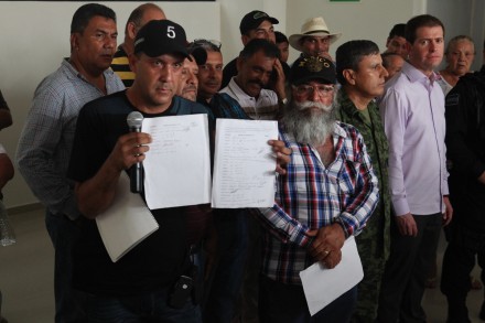 En tanto, tras una reunión en la 43 Zona Militar de Apatzingán, el comisionado Castillo Cervantes y los líderes de las autodefensas Estanislao Beltrán, Papá Pitufo, y Alberto Rodríguez, Comandante 5, ratificaron la destitución de Mireles.