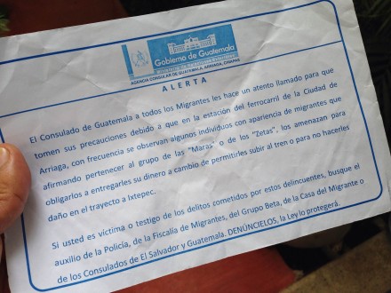 “El Consulado de Guatemala hace un atento llamado a todos los migrantes para que tomen sus precauciones debido a que en la estación de ferrocarril de la Ciudad de Arriaga, con frecuencia de observan algunos individuos con apariencia de migrante que afirmando pertenecer al grupo de las ‘Maras’o de ‘Los Zetas’, los amenazan para obligarlos a entregarles su dinero a cambio de permitirles subir al tren, o para no hacerles daño en el trayecto a Ixtepec”.