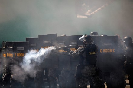 MÉXICO, D.F., (proceso.com.mx).- La policía brasileña lanzó gas lacrimógeno, bombas de estruendo y balas de goma a un grupo de manifestantes que intentaba marchar contra el Mundial sobre la avenida Radial Este de Sao Paulo.