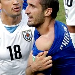 El astro uruguayo mordió el hombro del zaguero italiano un minuto antes de que su compañero Diego Godín marcara el gol con el que Uruguay eliminó al equipo europeo de la Copa del Mundo Brasil 2014.