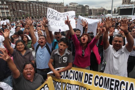 De hecho, el tradicional grito futbolero se volvió consigna entre los opositores al endurecimiento del Hoy no Circula: “¡Eeeeeeeeeeee puto!”, corearon infinidad de veces los comerciantes venidos de Iztapalapa, Benito Juárez, Xochimilco y Coyoacán, entre otras delegaciones.