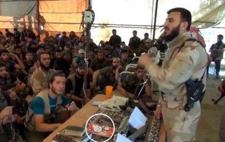 En la grabación, el dirigente de la brigada Jaysh Al-Islam (el Ejército del Islam), Zahran Alloush, habla sobre un grupo rival mientras en su escritorio se observa un bloc de notas con la imagen de Hello Kitty, personaje infantil representado por una gatita blanca con moño de color rosa.