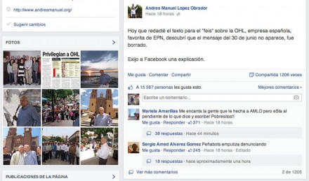 MÉXICO, D.F., (apro).- El fundador del partido político Movimiento de Regeneración Nacional (Morena), Andrés Manuel López Obrador, exigió a la red social Facebook una explicación por la presunta “desaparición” de un mensaje que publicó el pasado 30 de junio en el que señala a la empresa española OHL como “la favorita” del presidente Enrique Peña Nieto.