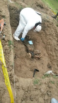 Las autoridades ministeriales cercaron la fosa clandestina localizada en un predio baldío, y se espera que mañana continúen las labores de excavación porque se estima que podría haber más cadáveres.
