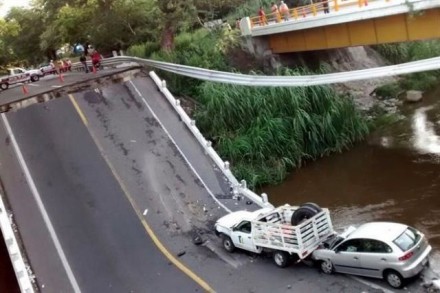 Protección Civil reportó que dos vehículos cayeron junto con el puente que se encuentra sobre la autopista que comunica el sur de Morelos con Iguala, Guerrero.