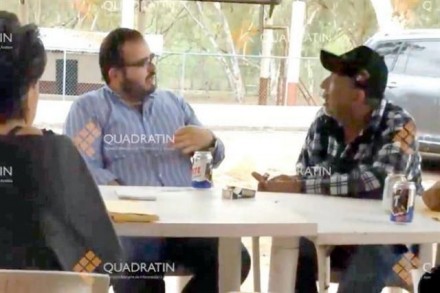 El hijo del gobernador toma una cerveza Tecate light. También se aprecia una cajetilla de cigarros. Una quinta persona graba el encuentro.