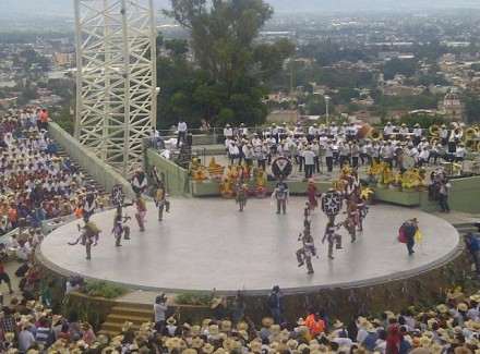 Como el acceso al magnífico cerro tiene una sola vía carretera, la gente se desplaza lo más cerca posible hasta las faldas. Todo lo demás es cuesta arriba por las terrazas de una empinada escalinata hasta las entradas del auditorio. En el camino los puestos de comida y artesanías son infinitos. Desde muy tempranito, al amanecer, las delegaciones de todos los rumbos ya están ahí, siguiendo una complicada logística para su participación. Las dos gradas laterales al círculo escénico son para ellas, y en la parte trasera se ha situado la inmensa orquesta que las acompañara a todas durante el evento. Entre las gradas y la banda hay apenas un breve espacio de entrada y salida de los grupos. No falta nada, la organización es perfecta. Además de los dos mil elementos de seguridad pública, un ejército cuida los accesos de la gente, la distribución de sus asientos, la entrega de regalos a cambio del boleto (sombreros, cojines para amortiguar el cemento de las tribunas, mapas). Con sus camisetas azules, muchachas y jóvenes dan la bienvenida a cada asistente y están dispuestos para cualquier atención.