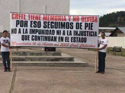 “Creel tiene memoria y no olvida, por eso seguimos de pie. No a la impunidad ni a la justicia que continúa en el estado”, decía la manta que encabezó la marcha y la misa del sexto aniversario.