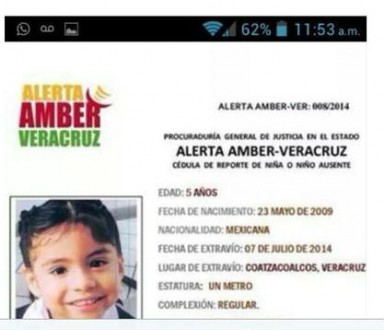La niña fue secuestrada junto con su tía Mónica Reyes Baruch hace 47 días, sin embargo, el gobierno de Javier Duarte activó esta alerta apenas este domingo ante la presión que han ejercido los padres de la menor a través de manifestaciones y protestas en el puerto de Coatzacoalcos.