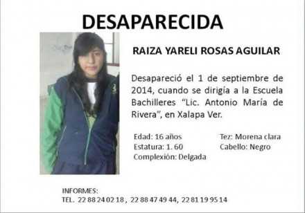 XALAPA, Ver. (apro).- Luego de la vapuleada que recibió el gobernador Javier Duarte en las redes sociales por emitir la Alerta Ámber 47 días después del secuestro de Karime Cruz Reyes, de cinco años, la Procuraduría General de Justicia del estado (PGJ) reaccionó esta vez más rápido y emitió la misma alerta por la desaparición de Raiza Yarely Rosas Aguilar, de 16 años, en esta capital.