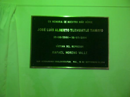 PUEBLA, Pue., (proceso.com.mx).- Con la develación de una placa conmemorativa que cita: “En memoria de nuestro niño héroe José Luis Alberto Tehuatlie Tamayo…víctima del represor Rafael Moreno Valle”, los habitantes de San Bernardino Chalchihuapan conmemoraron el Grito de Independencia.