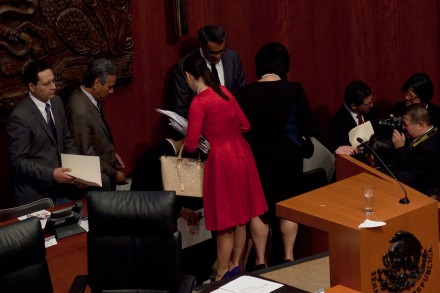 El bolso era sostenido por su asistente y fue captado por el fotógrafo Miguel Dimayuga mientras Robles Berlanga se despedía de los senadores.