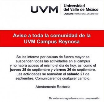 MÉXICO, D.F. (apro).- Autoridades de la Universidad del Valle de México (UVM) en Reynosa, Tamaulipas, ordenaron suspender este día las clases luego de la irrupción anoche de un comando de sicarios.
