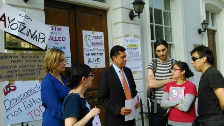 Los manifestantes entregaron una carta al embajador Diego Gómez Pickering para que comunique a Peña Nieto su preocupación por los ataques contra los normalistas de Guerrero, que dejaron seis muertos y más de 20 lesionados, así como por el incumplimiento de los tratados internacionales en materia de derechos humanos firmados por México.