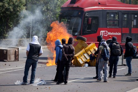Los manifestantes mantuvieron bloqueado durante dos horas el tránsito en ambos sentidos de Insurgentes y atravesaron una unidad del Metrobús para evitar la llegada de la policía.