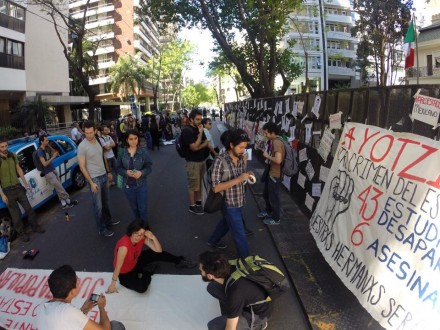 En tanto, en Buenos Aires, medio centenar de jóvenes tapizaron con mantas alusivas al “terrorismo de Estado que reina en México” y con fotos impresas de los estudiantes desaparecidos la reja de seguridad instalada frente al edifico de la embajada mexicana.