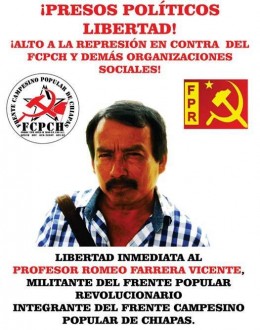 MÉXICO, D.F., (apro).- Organizaciones civiles y campesinas condenaron la detención del presidente Estatal del Frente Popular Revolucionario (FPR) en Chiapas, Romeo Farrera Vicente, y exigieron al gobernador del estado, Manuel Velasco, su inmediata liberación.