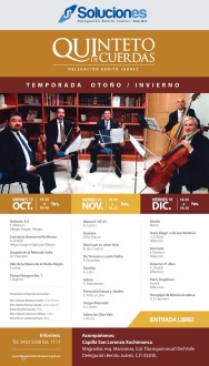 Este viernes habrá música en la histórica Capilla de San Lorenzo Xochimanca, en la colonia Tlacoquemécatl. A través de la Delegación Benito Juárez el Quinteto de Cuerdas presentará un variado recital que incluye la Sinfonía A4 de T. Albinoni, el Concierto Grosso en Re Menor de Vivaldi, la Llegada de la Reina de Saba de G. F Haendel, el “Vals” de la ópera de La viuda alegre de F. Lehar; y para rematar la Danza húngara número 1 de J. Brahms. Esta será la primera de tres presentaciones de la agrupación integrada por Antonio Medrano (violín primero), Martín Medrano (violín segundo), Rubén Bedolla (viola), Héctor Candanedo (bajo), y Valentín Lubomirov, quienes realizarán este programa gratuitamente hoy a las 18:30 horas en esta capilla del siglo XVI, en Magnolias esquina Manzanas, colonia Tlacoquemecatl del Valle, METRO Insurgentes sur y Metrobús Parque Hundido). Las otras dos presentaciones se programaron para los viernes 21 y 19 de diciembre, todas con repertorio distinto.