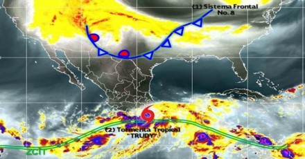 Trudy tiene vientos máximos sostenidos de 75 km/hr, rachas de hasta 95 km/hr, y un desplazamiento hacia el norte a 7 km/hr.