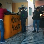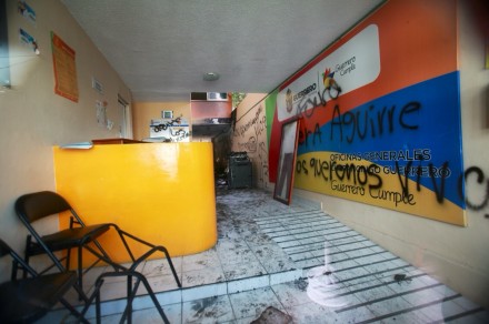 Los agresores hicieron pintas con aerosol en las paredes del lugar para exigir la destitución de Aguirre Rivero y la presentación con vida de los 43 estudiantes de la Escuela Normal Rural de Ayotzinapa desaparecidos desde hace tres semanas.