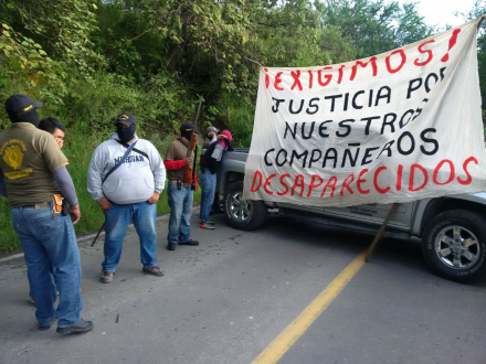 Encapuchados y portando escopetas y fusiles calibre .223, los guardias comunitarios se encuentran apostados en el acceso a la normal de Ayotzinapa y el crucero que conduce al municipio de Apango y Chilapa.
