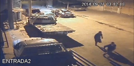 Alrededor de las 03:10 horas, una patrulla pasa por el lugar y se estaciona frente a la camioneta. Dos de los hombres echan a correr, otros dos se acercan al par de agentes dentro del vehículo policiaco, quienes descienden e intercambian algunas palabras, sin perseguir a los que corrieron.