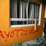 En el inmueble, los manifestantes dejaron pintas que sintetizan el coraje del sector de la ciudadanía que demanda la presentación con vida de los estudiantes desaparecidos y castigo a los responsables de la masacre de Iguala: “Traidores Narcogobierno”.