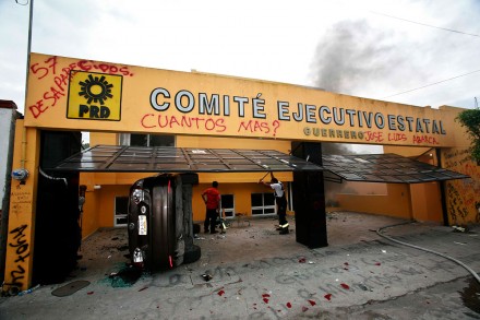Luego, prendieron fuego al lugar y se retiraron en medio de consignas en contra de los principales líderes del sol azteca en la entidad, quienes han sido señalados por autoridades federales por sus presuntos nexos con el narco, entre ellos el dirigente estatal Carlos Reyes; el presidente del Congreso local, Bernardo Ortega, y el alcalde prófugo de Iguala recién defenestrado, José Luis Abarca Velázquez.